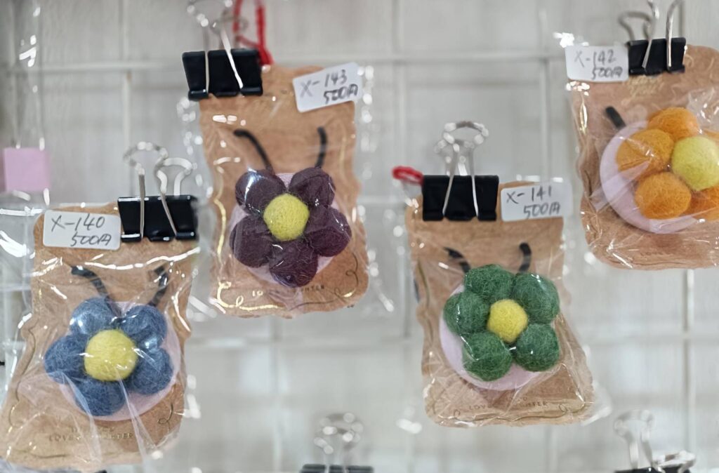 小さな羊毛ボールをつなぎ合わせた、お花のヘアゴムです。